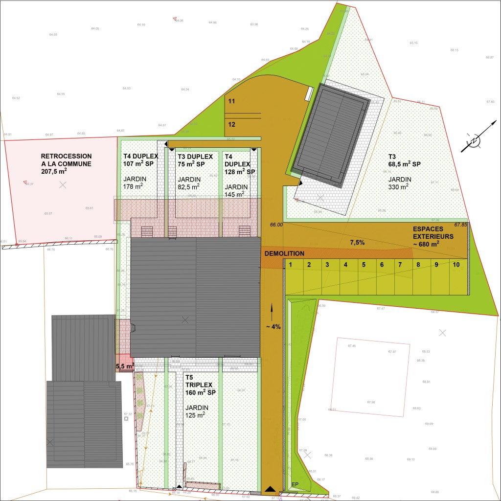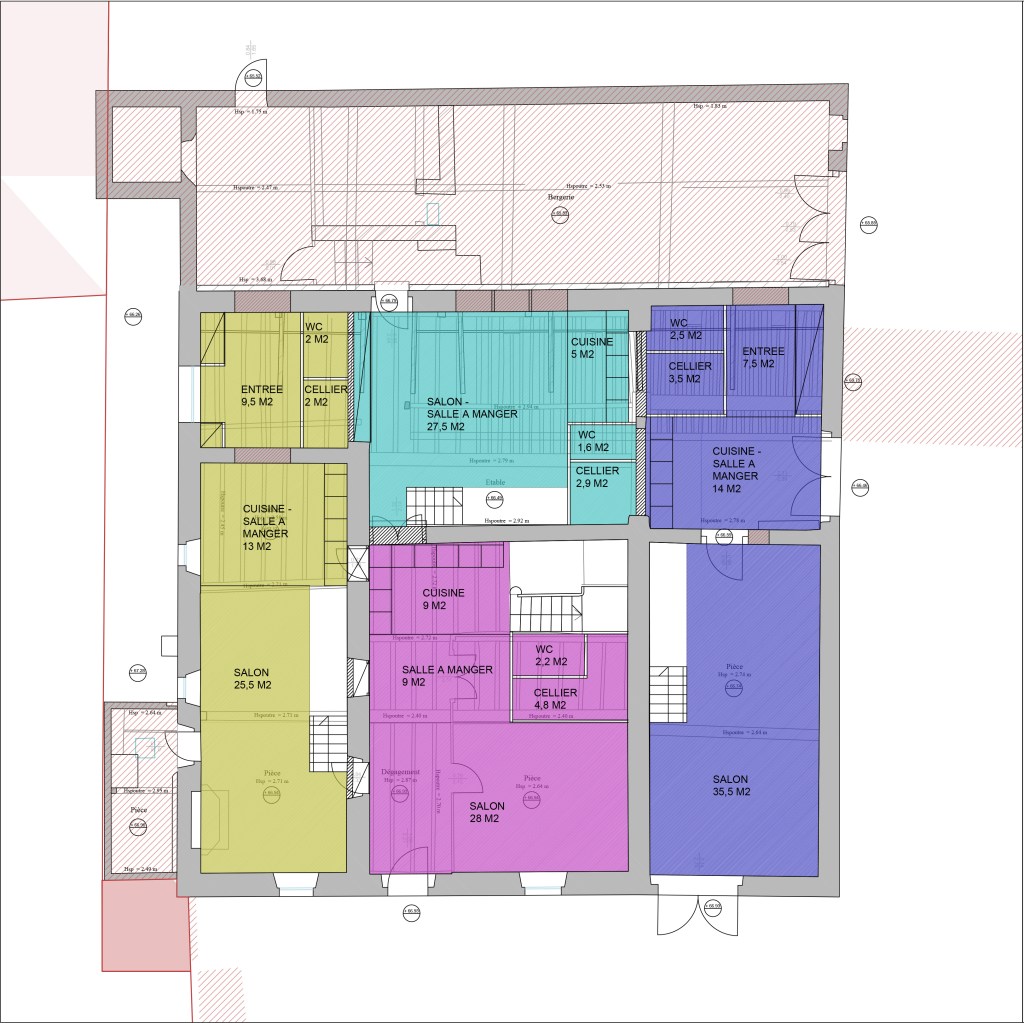 Dans le but d’accueillir des familles au bourg, réhabilitation d’une ancienne ferme en 5 logements individualisés : accès et jardins indépendants, pas de superposition grâce aux duplex, espaces en commun limités à l’extérieur. Faisabilité destinée à un opérateur de logements sociaux et en Bail Réel Solidaire.