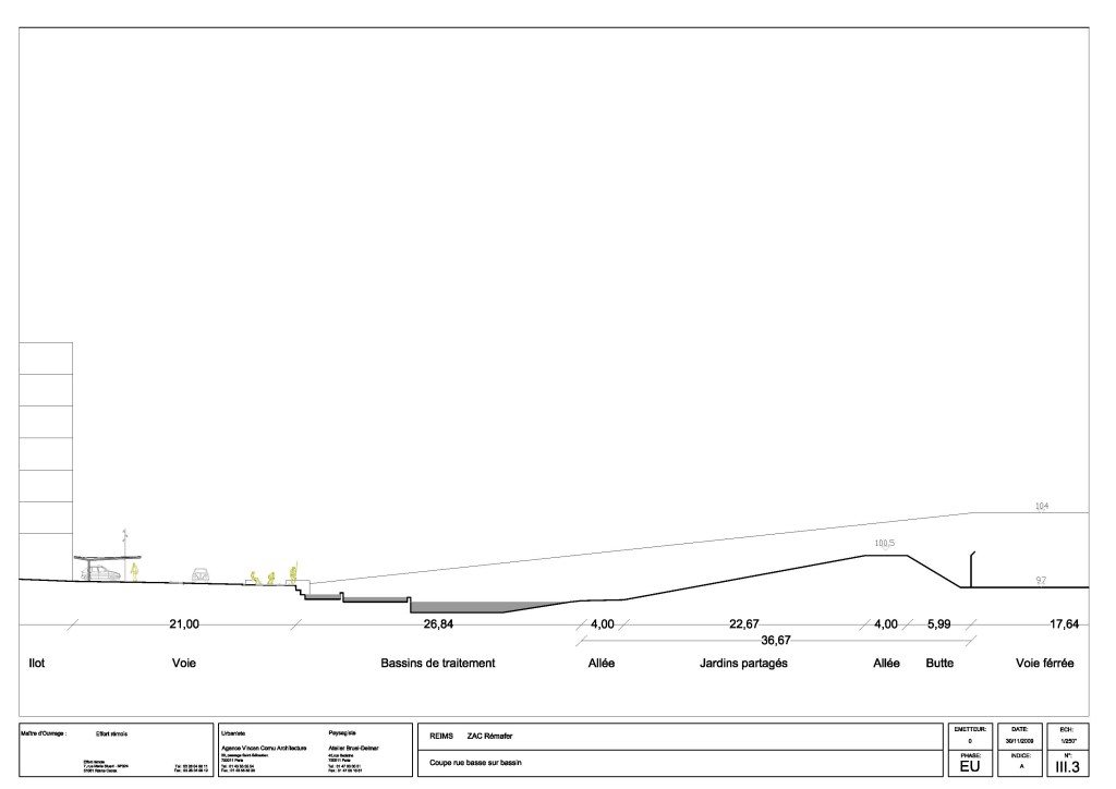 A une échelle plus proche, c’est la gestion de l’eau de pluie qui oriente et organise l’espace public ; ruelles doublées de noues, conduisant à un bassin de rétention et de dépollution.