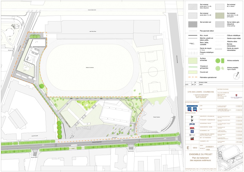 La Ville de Courbevoie souhaite développer autour de son stade historique une ‘cité des loisirs’ en remplaçant et complétant les équipements déjà présent sur l’îlot. Le travail porte sur l’aménagement des espaces extérieurs et notamment le vaste parvis du pôle spectacle. Un travail de nivellement permet de ‘poser’ le bâtiment sur le parvis sans rupture de pente depuis le boulevard requalifé.